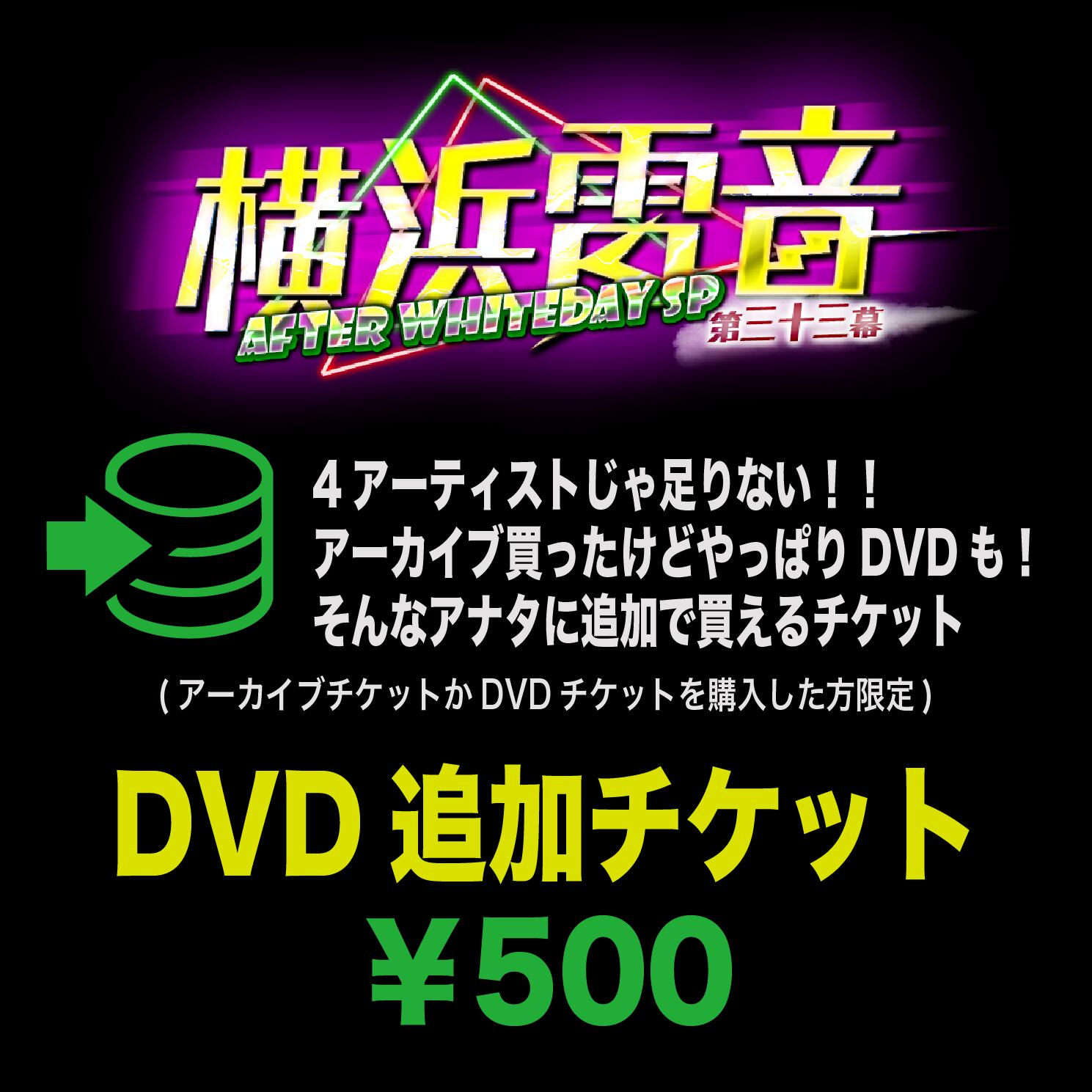 「4アーティストじゃ足りない!」そんなあなたへの追加チケット。 本商品は、アーカイブチケットやDVDチケットをご購入いただいた方が、さらに収録アーティストを増やしたい時や、後からDVDを形に残したくなった時に追加でご購入いただけるチケットです。