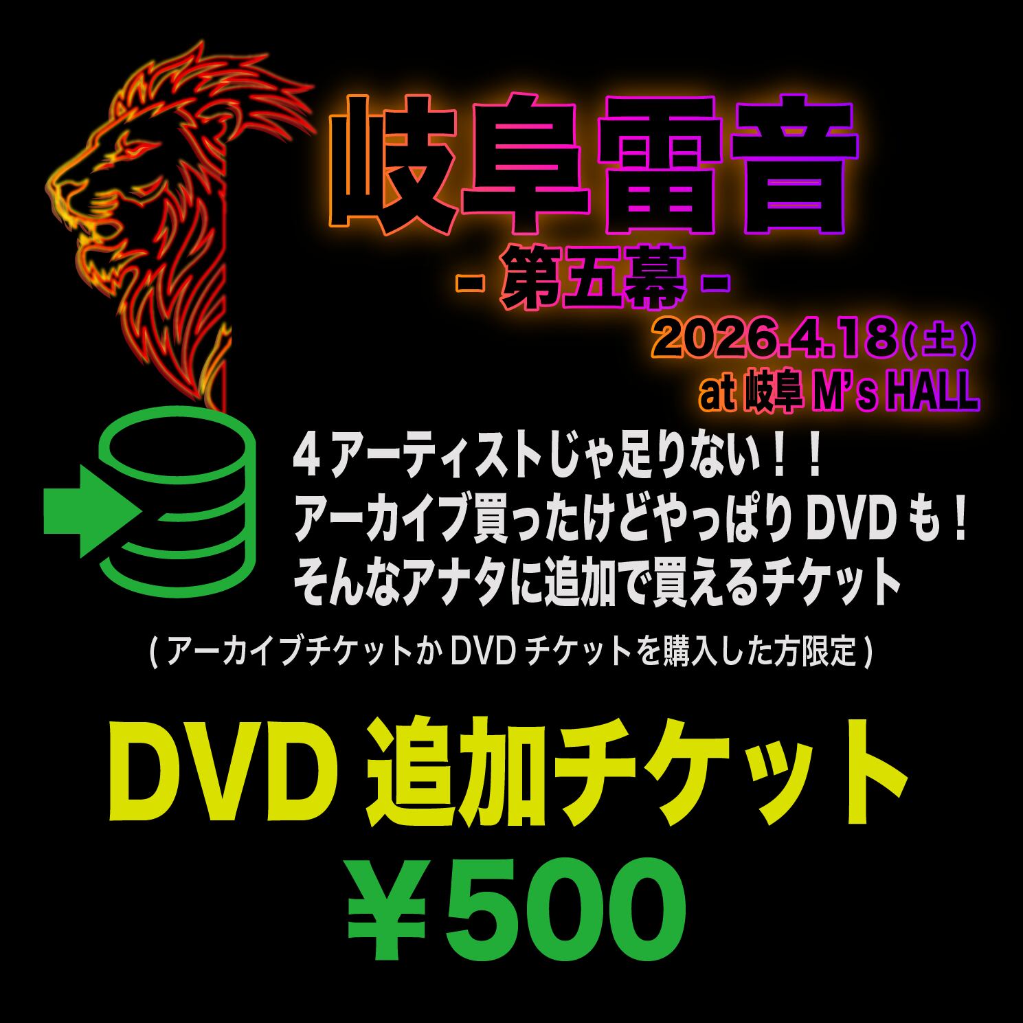 「4アーティストじゃ足りない!」そんなあなたへの追加チケット。 本商品は、アーカイブチケットやDVDチケットをご購入いただいた方が、さらに収録アーティストを増やしたい時や、後からDVDを形に残したくなった時に追加でご購入いただけるチケットです。